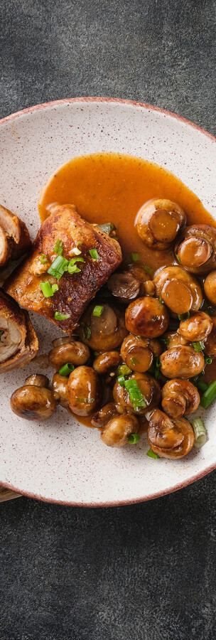 Vepřová panenka s houbovou omáčkou a liškami (1,7,9) / 150g / 312 Kč